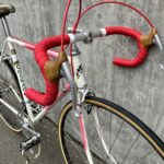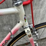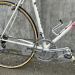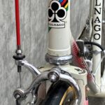 Another “modern” touch is the beautiful airbrushed grid paint. The paint on this particular Colnago marks it as an ‘80’s bike. Earlier Supers were solid colors, sometimes with a contrasting painted panel. Those are the changes, yet there are still some features common with the earliest versions like the Columbus SL tubing, the flat-crown fork and the single water-bottle mount. Unlike most bikes newer than the ‘85 model year, this still has the cable guide that runs the shift wires over the top of the bottom bracket area.