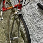 This frame was a trade-in. It was made in the early ’80’s of Columbus SL cromoly steel tubing, it’s a 55cm frame and it will fit a rider in the 5’7″ to 5’10” height range quite well.