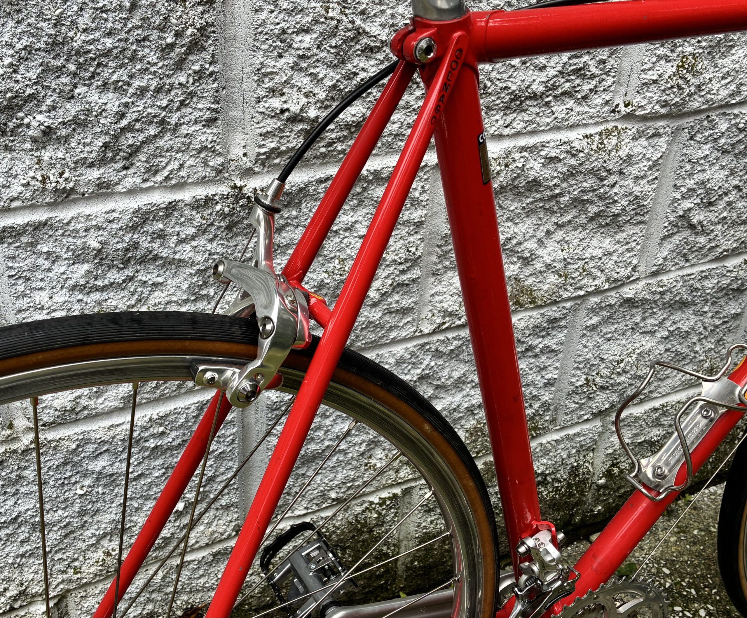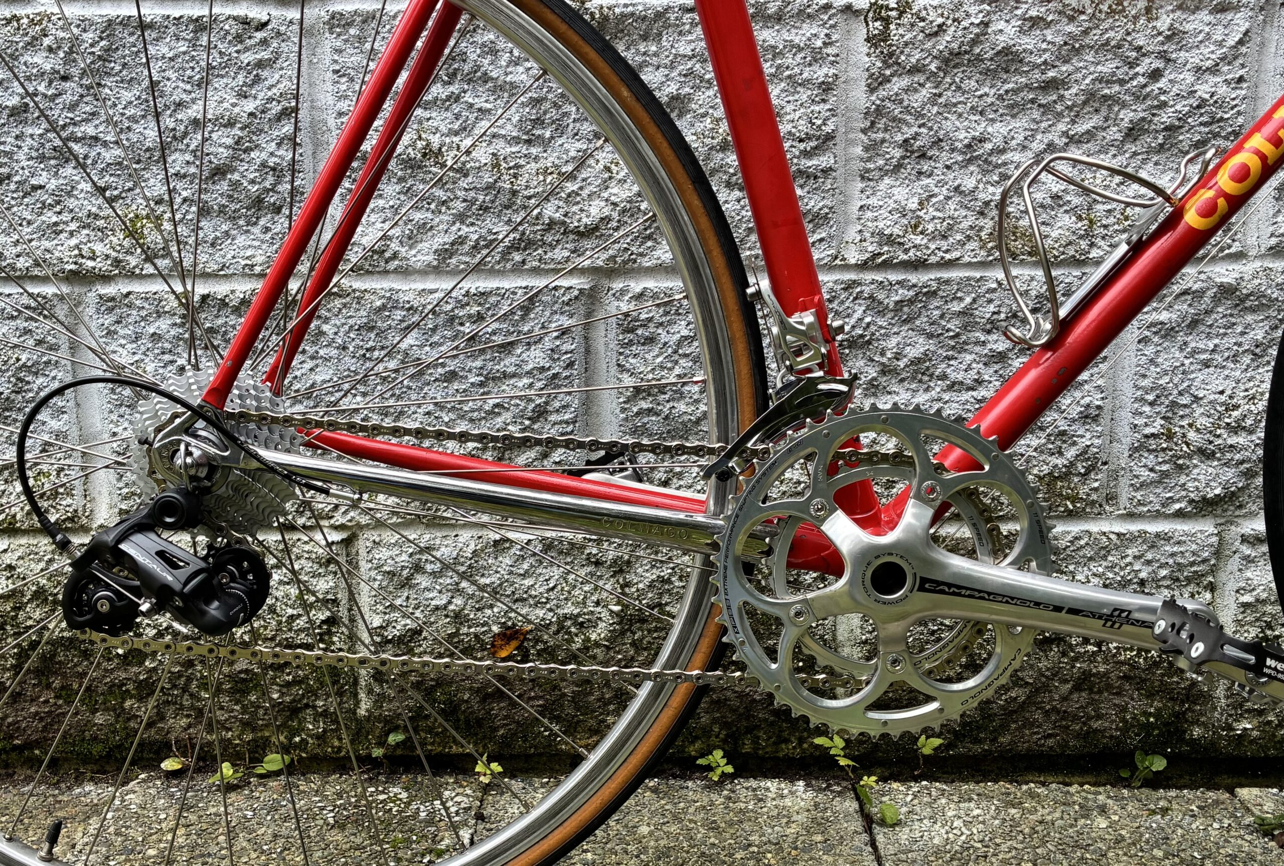 We built the bike with new Campagnolo Centaur 11 speed equipment (sporting a compact crankset), it has hand built wheels made from Velo Orange rims and new Miche hubs. A vintage Campy Chorus seatpost holds up the Selle San Marco laser saddle (the white Selle Italia saddle in the photos has been upgraded) and you get Ernesto Colnago’s signature pantographed on the vintage 3TTT stem that is securing the handlebar.